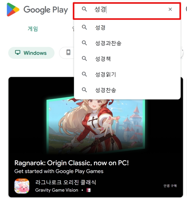 처음 스마트폰으로 무언가 찾으려 하면 어디서부터 건드려야 할지 막막할 때가 있죠. 검색을 통해 스토어 홈페이지로 접속하신 뒤 검색창에 성경이라고 입력하는 것부터 시작하시면 됩니다. 저는 스토어에 들어가서 돋보기 모양을 누른 뒤 평소 궁금했던 단어를 입력하는 이 첫 번째 순서가 가장 설레더라고요. 자동 완성 목록이 주르륵 뜨면 그중에서 내가 찾던 것을 선택하는 재미도 쏠쏠하답니다.