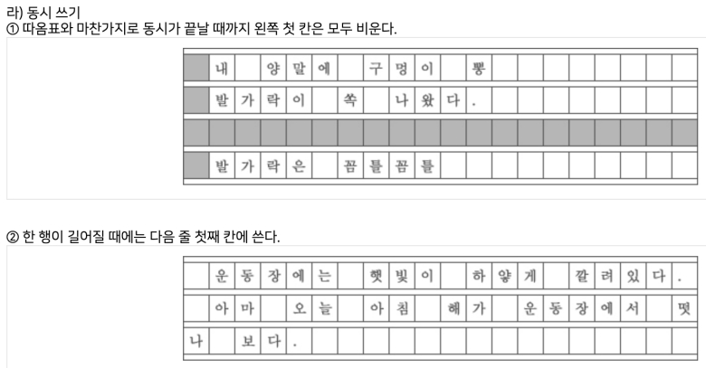 문장 끝에 물음표나 느낌표가 딱 걸치면 어떻게 할지 막막하죠. 그럴 때는 고민하지 말고 다음 줄 첫 칸에 기호를 바로 적어주면 돼요. 하지만 마침표나 쉼표는 글자가 적힌 마지막 칸에 같이 넣어주거나 칸 바로 밖에 살짝 걸쳐서 적어도 괜찮으니 참고하세요.