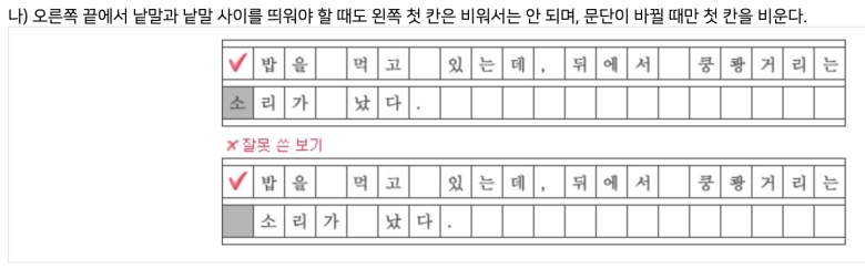 글을 쓰다 보면 줄 끝에서 띄어쓰기를 해야 할 상황이 생기는데 이때 다음 줄 첫 칸을 비우면 안 돼요. 저도 처음엔 습관적으로 다음 줄 첫 칸을 비웠다가 지저분해 보여서 고생했거든요. 문단이 바뀌는 게 아니라면 무조건 첫 칸부터 채워서 써야 해요.