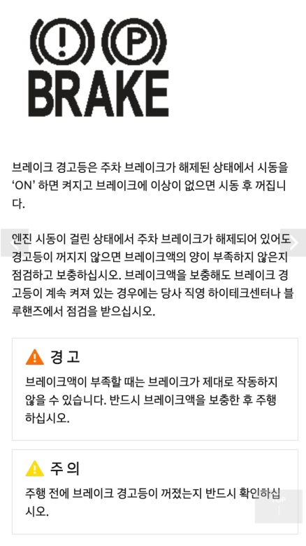 주차 브레이크, 즉 사이드 브레이크를 채운 상태로 시동을 걸면 브레이크 경고등이 켜져 있는 걸 볼 수 있어요. 이건 정상적인 상황이고, 주차 브레이크를 풀면 바로 꺼진답니다. 하지만 주차 브레이크를 풀었는데도 경고등이 계속 켜져 있다면, 브레이크액이 부족하다는 신호일 수 있어요. 브레이크는 안전에 가장 중요한 부분 중 하나잖아요. 저도 예전에 이 경고등이 뜬 적이 있는데, 브레이크액을 보충해주니 바로 사라지더라고요.