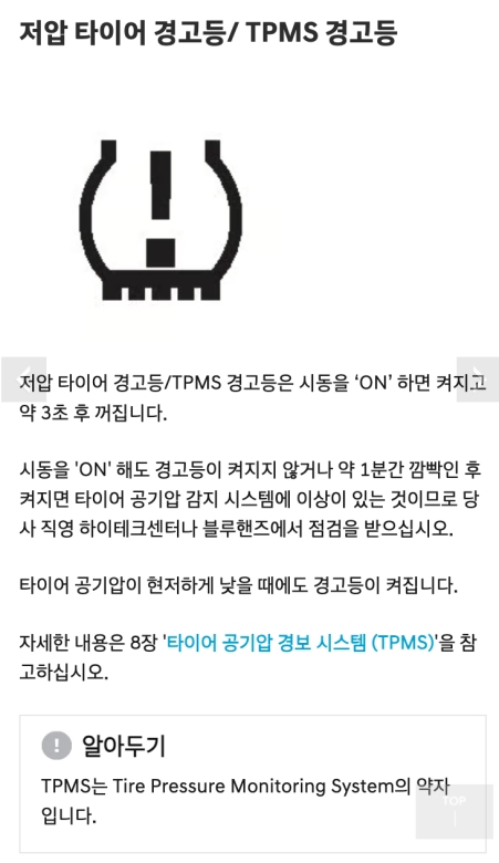 괄호 안에 느낌표가 있고 아래가 톱니바퀴처럼 생긴 것은 저압 타이어/TPMS 경고등이에요. TPMS는 타이어 공기압을 감지하는 시스템이죠. 시동을 켜면 3초 정도 켜졌다가 꺼지는데, 계속 켜져 있다면 타이어 중 하나의 공기압이 현저히 낮다는 신호예요. 만약 경고등이 약 1분간 깜빡인 후에 계속 켜져 있다면, 타이어 공기압 감지 시스템 자체에 문제가 있다는 뜻이니 이 또한 점검이 필요합니다.