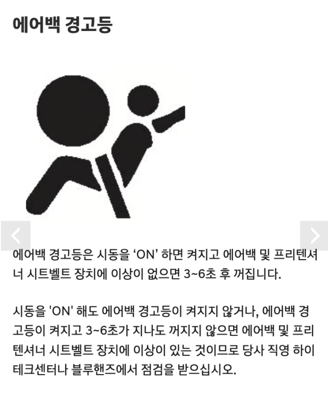 시동을 걸면 여러 경고등이 잠시 켜졌다가 사라지는데, 그중 하나가 바로 에어백 경고등이에요. 보통 시동 후 3초에서 6초 사이에 저절로 꺼지는 게 정상이랍니다. 만약 시동을 걸어도 이 경고등이 아예 켜지지 않거나, 6초가 지나도 사라지지 않고 계속 켜져 있다면 에어백 시스템에 문제가 있을 수 있다는 신호예요. 주행 중에 갑자기 켜지는 경우도 마찬가지고요. 안전과 직결된 부분이니, 이럴 땐 꼭 가까운 서비스센터에서 점검을 받아보는 게 좋아요.