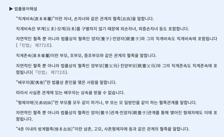 법률에서는 이 범위를 조금 더 명확하게 정의하고 있어요. 예를 들어, '배우자'는 직계존속이나 비속에 포함되지는 않지만, 상속에 있어서는 아주 특별한 지위를 가집니다. 1순위인 직계비속이나 2순위인 직계존속이 있을 경우, 그들과 함께 공동으로 상속을 받게 되죠. 만약 1, 2순위 상속인이 모두 없다면 배우자가 단독으로 모든 재산을 상속받게 돼요. 하지만 사실혼 관계의 배우자는 법적으로 상속을 받을 수 없다는 점도 알아두어야 합니다.