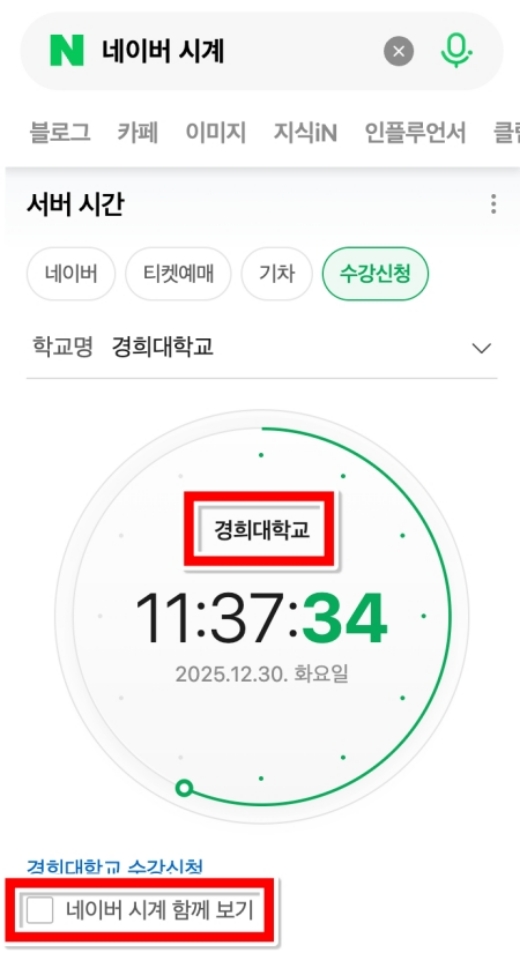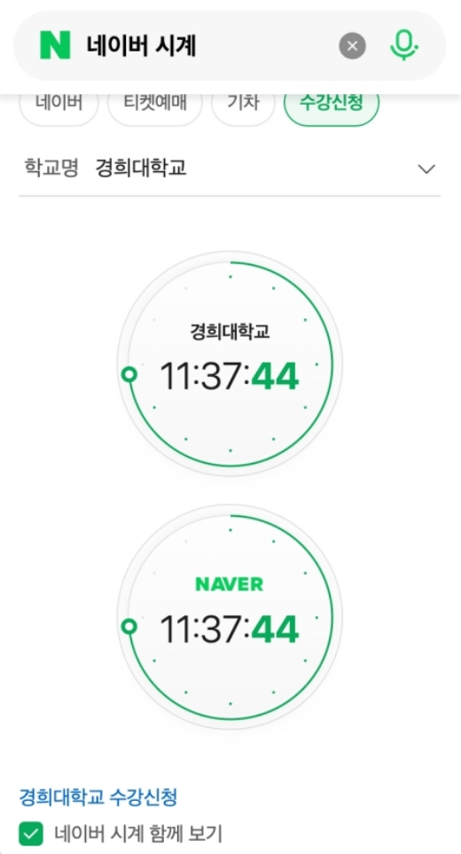 학교를 제대로 골랐다면 이제 화면에 나타난 숫자를 보며 마지막 체크를 시작합니다. 경희대학교를 예시로 골라봤는데 화면 아래쪽에 있는 네이버 시계 함께 보기라는 체크 박스가 보이실 거예요. 저도 처음에는 이게 왜 필요한가 싶었는데 두 가지를 비교해서 보면 더 확실하더라고요. 이걸 체크하면 화면 구성이 살짝 바뀌면서 두 가지 숫자가 동시에 나타나게 됩니다.