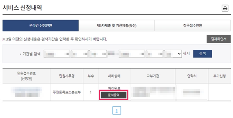 신청을 하고 나면 잠시 후에 '서비스 신청내역' 페이지로 이동해요. 여기서 내가 신청한 민원의 처리 상태를 확인할 수 있는데, 처리가 완료되면 '처리상태' 란에 '문서출력'이라는 버튼이 생길 거예요. 이 버튼을 선택하면 발급된 초본을 미리 볼 수 있는 새 창이 열려요.