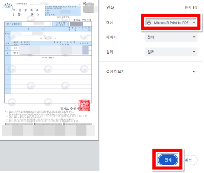 인쇄 창이 뜨면 실제로 종이로 출력할 수도 있지만, 프린터가 없거나 파일로 제출해야 한다면 PDF로 저장할 수 있어요. 대상 프린터 목록에서 'Microsoft Print to PDF'를 선택한 뒤 아래의 파란색 '인쇄' 버튼을 선택하면, 서류가 컴퓨터에 파일 형태로 깔끔하게 저장돼요.