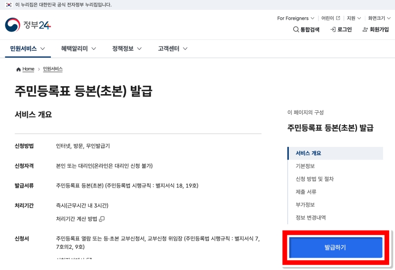 다음 화면으로 넘어가면 서비스에 대한 상세한 설명이 나와요. 내용이 많아 보이지만 우리는 발급만 받으면 되니, 오른쪽을 봐주세요. 화면 오른쪽에 파란색으로 된 '발급하기' 버튼이 바로 보일 거예요. 이 버튼을 선택해서 다음으로 진행해 주세요.