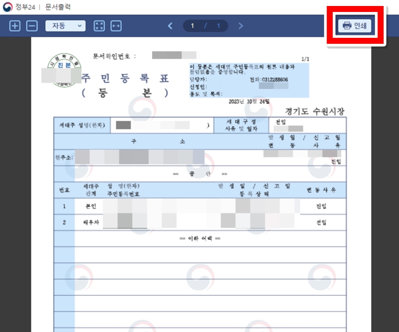드디어 발급된 내 초본을 확인할 수 있는 문서 창이 떴어요. 내용에 이상이 없는지 꼼꼼히 살펴본 후에, 화면 오른쪽 위에 있는 프린터 모양의 '인쇄' 아이콘을 선택해 주세요. 이제 정말 마지막 과정만 남았답니다.