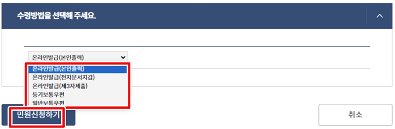 이제 거의 다 왔어요. 마지막으로 서류를 어떻게 받을지 '수령방법'을 정할 차례인데요. 집에서 바로 출력하거나 파일로 저장하려면 '온라인발급(본인출력)'을 선택하면 돼요. 모든 선택을 마쳤다면, 화면 아래에 있는 '민원신청하기' 버튼을 선택해 주세요.