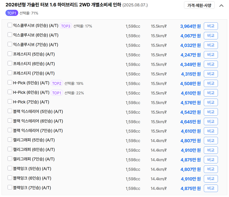 - 시트 구성: 3열 시트가 필요하다면 7인승을 선택하고, 트렁크 공간을 최대한 확보하려면 5인승을 추천합니다.