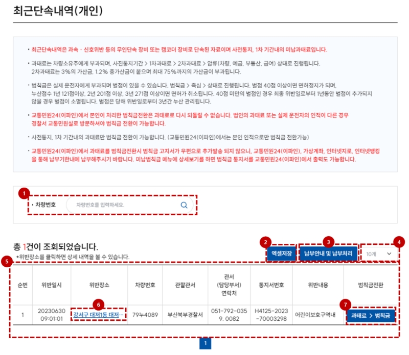 로그인을 마치면 개인 차량의 최근 단속 내역이 목록으로 나타나요. 언제, 어디서 단속되었는지 한눈에 볼 수 있죠. 여기서 중요한 점은 위반 장소를 누르면 상세 내용을 볼 수 있고, 오른쪽의 '과태료 > 범칙금' 부분을 통해 벌점 없는 과태료를 벌점이 있는 범칙금으로 전환 신청할 수도 있다는 점이에요.