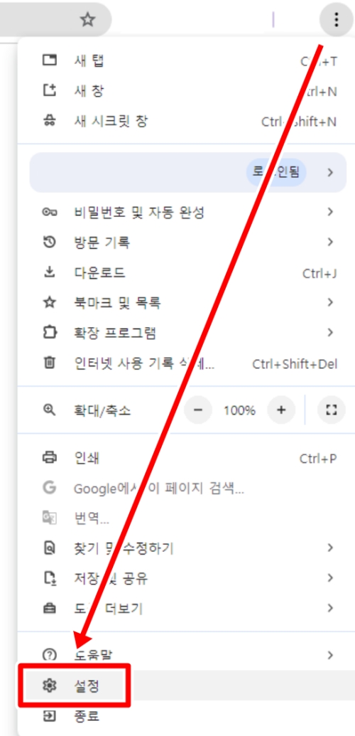 이제 본격적으로 자동 로그인 설정을 해볼게요. 크롬 브라우저를 기준으로, 오른쪽 위에 있는 점 세 개 모양의 메뉴를 열어주세요. 여러 항목 중에서 아래쪽에 있는 톱니바퀴 모양의 '설정'을 선택하면 브라우저의 다양한 기능을 조절할 수 있는 페이지로 이동하게 됩니다.