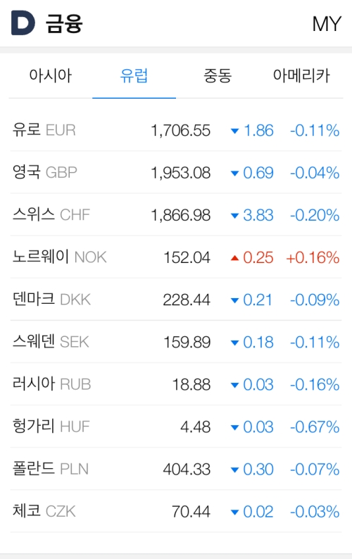 유럽 여행을 준비 중이라면 '유럽' 탭이 유용하겠죠. 유로, 영국 파운드, 스위스 프랑 등 유럽 각국 통화의 환율 정보를 한눈에 볼 수 있어서, 여행 경비를 계획할 때 큰 도움이 될 것 같았어요.