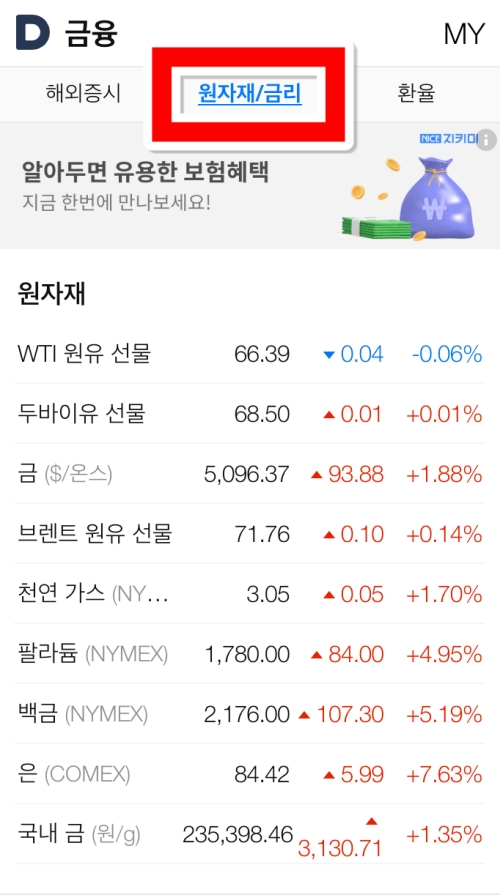 환율 정보뿐만 아니라 다른 경제 지표도 궁금하다면 '환율' 탭 옆에 있는 '원자재/금리' 메뉴를 눌러보세요. 이곳에서는 국제 유가(WTI, 두바이유)나 금, 은 같은 주요 원자재의 실시간 가격을 확인할 수 있어서 유용하더라고요.