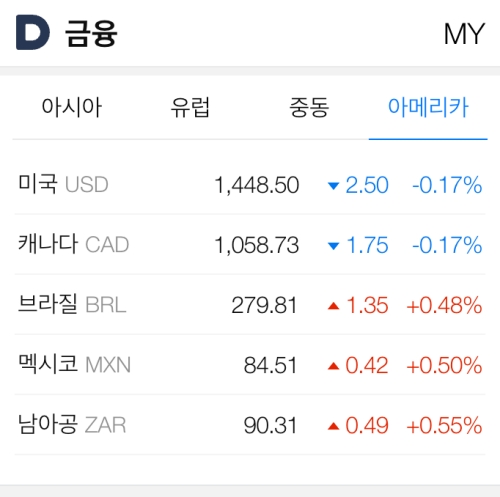 물론 아메리카 대륙의 환율 정보도 빠질 수 없죠. '아메리카' 탭에서는 미국 달러뿐만 아니라 캐나다, 브라질, 멕시코 등 여러 나라의 환율 변동 상황을 실시간으로 파악할 수 있었답니다.