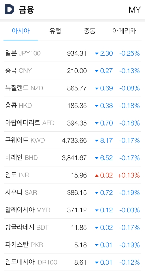 다른 아시아 국가들의 환율이 궁금하다면 '아시아' 탭을 눌러보면 돼요. 일본, 중국, 뉴질랜드, 홍콩 등 여러 아시아 및 오세아니아 국가들의 통화가 원화 대비 얼마인지, 그리고 어제보다 얼마나 오르고 내렸는지 실시간으로 확인할 수 있답니다.