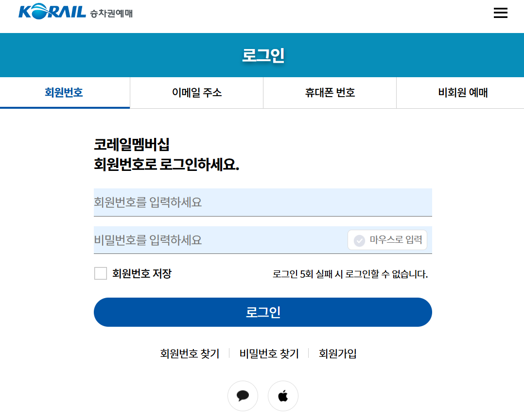 7. 예매를 마치려면 로그인이 필요해요. 코레일멤버십 아이디로 로그인하거나 비회원으로도 예매가 가능해서 처음이신 분들도 어렵지 않게 진행할 수 있어요.