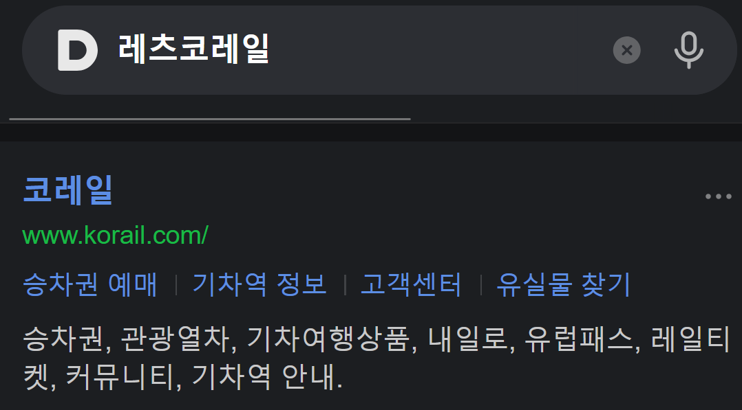 1. 검색창을 활용해 코레일로 이동합니다. 코레일은 전국 열차를 실시간으로 조회하고 예매할 수 있는 공식 철도 서비스 사이트예요.
