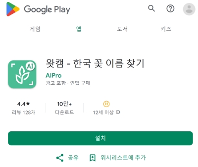 수많은 앱 중에서 뭘 써야 할지 막막할 때, 구글 플레이 스토어에서 '왓캠'이라고 검색하면 쉽게 찾을 수 있어요. '한국 꽃 이름 찾기'라는 부제처럼 우리나라 식물에 특화된 앱이라 더 믿음이 가더라고요. 평점도 4.4점으로 높은 편이라 망설임 없이 설치했답니다.