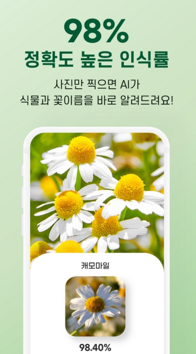 결과를 보고 정말 놀랐어요. 무려 98%에 달하는 높은 정확도로 제가 찍은 꽃이 '캐모마일'이라는 것을 정확히 맞히더라고요. 비슷한 꽃 사진과 함께 인식 확률까지 보여주니 신뢰도가 더욱 높아졌어요. 인공지능 기술이 정말 대단하게 느껴지는 순간이었답니다.
