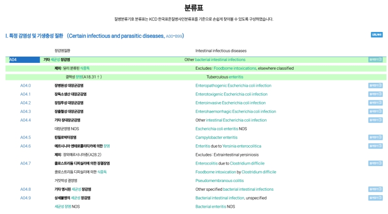 예를 들어, 코드 'A04'를 검색해보니 '기타 세균성 장감염'이라는 결과를 바로 확인할 수 있었어요. 그 아래로는 A04.0, A04.3처럼 더 세분된 하위 분류 코드들까지 목록으로 보여주더라고요. 이렇게 코드를 통해 정확한 질병명을 알 수 있으니 정말 편리했어요.