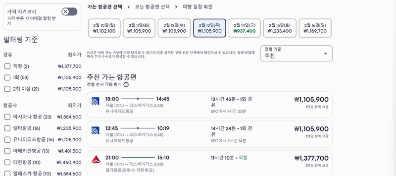 익스피디아에서 라스베이거스로 가는 항공편을 찾아보니, 날짜별로 가장 저렴한 가격을 그래프처럼 보여줘서 유용했어요. 추천 항공편 목록에서는 유나이티드항공, 델타항공 등 여러 항공사의 가격과 경유 시간을 비교하며 나에게 가장 맞는 일정을 고를 수 있었답니다.