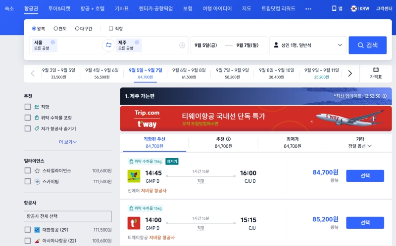검색을 마치면 순식간에 수많은 항공편이 눈앞에 펼쳐져요. 제가 서울에서 제주 가는 비행기를 찾아보니, 진에어, 티웨이항공 등 다양한 항공사의 항공편과 가격이 한눈에 비교되어서 정말 편리하더라고요. 가장 저렴한 표부터 인기 있는 추천 항공편까지 바로 확인할 수 있었답니다.