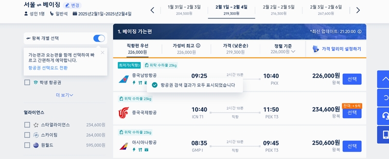 서울에서 베이징으로 가는 항공권을 검색하니, 날짜별로 가장 저렴한 가격이 상단에 표시되어 비교하기 쉬웠어요. 검색 결과 목록에서는 중국남방항공, 중국국제항공 등 여러 항공사의 가격과 출발 시간을 비교하며 가장 좋은 조건을 선택할 수 있었답니다.