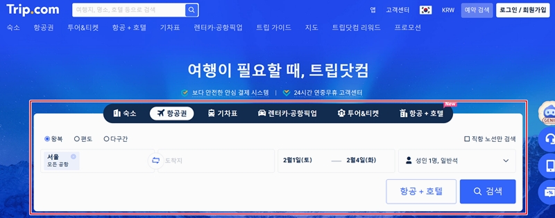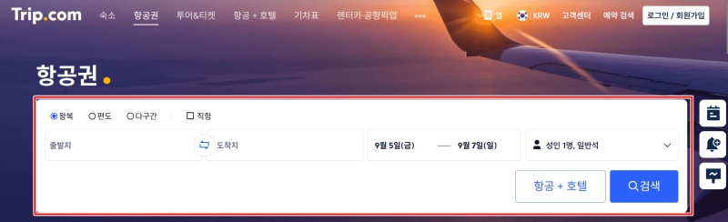다시 트립닷컴 같은 사이트로 돌아와 이번에는 국제선 항공권을 찾아봤어요. 앞서 살펴본 다른 곳들과 마찬가지로, 메인 화면의 익숙한 검색창에 출발지와 도착지, 날짜를 입력하면 바로 검색을 시작할 수 있어서 사용하기 정말 편했어요.