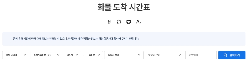'화물 도착 시간표' 검색 화면이 나타나면, 마찬가지로 날짜와 시간, 출발지, 항공사 등을 선택해서 검색할 수 있어요. 국제 화물을 기다리거나 관련 업무를 볼 때 아주 유용하게 쓸 수 있는 기능이랍니다.