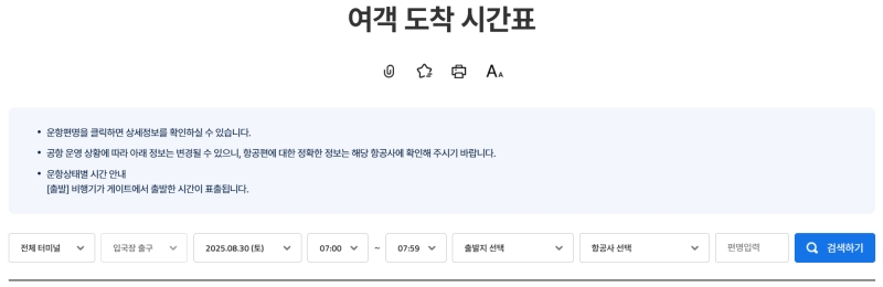 이제 '여객 도착 시간표'를 검색할 수 있는 화면이 나와요. 날짜와 시간, 출발지, 항공사 등 내가 알고 있는 정보를 입력하면 더 정확하게 찾아볼 수 있어요. 특별한 정보가 없다면 날짜와 시간대만 설정하고 검색해도 그 시간에 도착하는 모든 비행기 목록을 볼 수 있답니다.