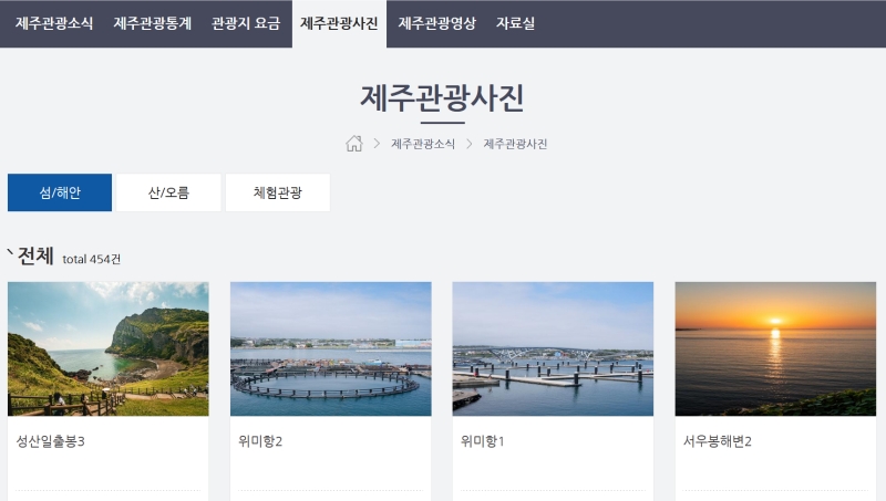 어느 곳을 여행할지 아직 정하지 못했다면 '제주관광사진' 메뉴에서 영감을 얻어보는 건 어떨까요. 성산일출봉, 위미항 등 제주도의 아름다운 명소들을 담은 고품질의 사진들이 테마별로 잘 정리되어 있습니다. 사진을 구경하다 보면 '아, 여기는 꼭 가봐야겠다'하는 나만의 여행지를 발견하게 될지도 몰라요.