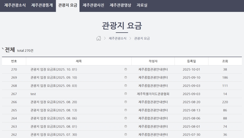 여행 예산을 짤 때 가장 중요한 정보 중 하나가 바로 입장료일 텐데요. '관광지 요금' 메뉴를 활용하면 이 고민을 쉽게 해결할 수 있습니다. 주요 관광지들의 입장료 정보를 주기적으로 업데이트해서 표 형태로 제공하기 때문에, 방문하고 싶은 곳들의 요금을 미리 확인하고 전체 경비를 계획하는 데 아주 유용하게 사용할 수 있습니다.