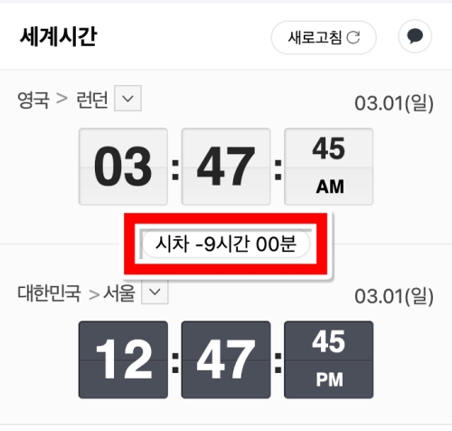이렇게 런던의 시간도 초 단위까지 정확하게 확인할 수 있게 되었습니다. 우리나라와의 시차까지 자동으로 계산해서 보여주니, 해외 사이트 예매 시 시간을 착각해서 소중한 기회를 놓치는 실수를 방지할 수 있습니다.