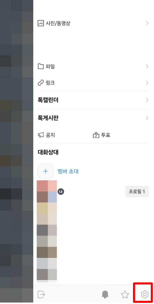 메뉴 서랍이 열리면 사진, 파일, 톡게시판 등 여러 기능들이 나열되어 있어 처음에는 조금 복잡하게 느껴질 수 있어요. 당황하지 마시고, 서랍의 맨 아래쪽을 봐주세요. 오른쪽 구석에 작은 톱니바퀴 모양의 '설정' 아이콘이 숨어있답니다. 이 아이콘이 바로 이 채팅방의 세부 설정을 변경할 수 있는 곳이니, 가볍게 눌러주시면 됩니다.
