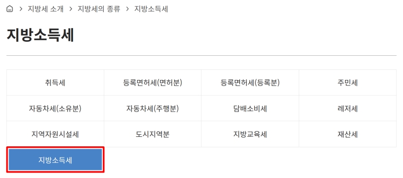 지방세의 종류에는 취득세, 주민세, 재산세 등 정말 여러 가지가 있네요. 이 중에서 우리가 5월 종합소득세 신고와 관련하여 꼭 알아두어야 할 세금은 바로 '지방소득세'입니다. 이 항목을 선택하면 지방소득세에 대한 모든 상세 정보를 확인할 수 있는 페이지로 이동합니다.