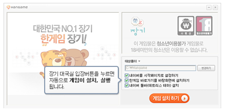 '대국실 입장하기'를 누르면 대부분의 경우 이렇게 게임을 설치하는 작은 창이 하나 나타나요. 웹사이트에서 바로 실행되는 방식이 아니라, 조금 더 안정적인 환경에서 게임을 즐길 수 있도록 전용 프로그램을 설치하는 과정이에요. 처음 한 번만 설치하면 다음부터는 바로 입장이 가능하니 번거롭다고 생각하지 마시고 '게임 설치 하기' 를 눌러주세요. 금방 끝나요.