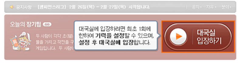 성공적으로 로그인을 마쳤다면, 이제 본격적으로 게임을 즐기러 가볼 차례예요. 화면 중앙에 있는 '대국실 입장하기'라고 적힌 큼지막한 버튼이 보이시죠? 저도 처음엔 저걸 누르면 바로 게임이 시작되는 건가 싶었는데, 게임을 하기 위한 준비 단계로 넘어가는 입구라고 생각하시면 돼요. 망설이지 말고 눌러서 다음으로 넘어가면 된답니다.