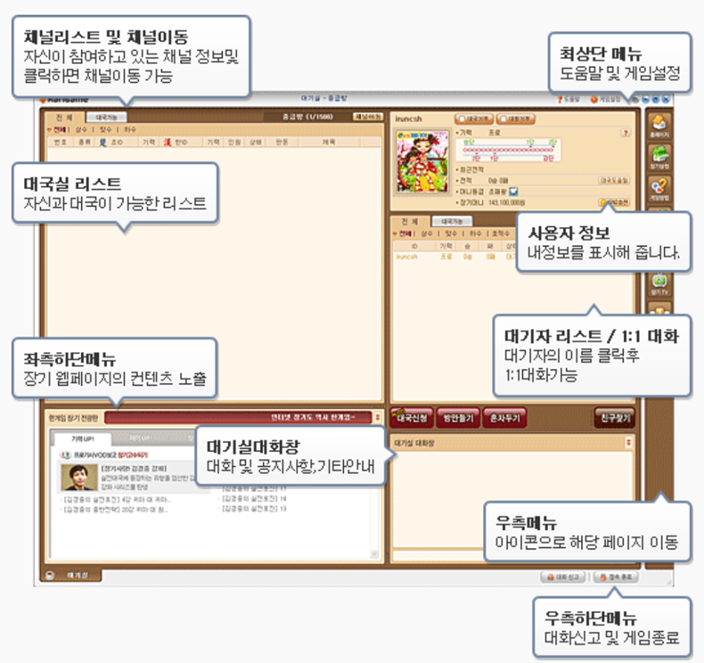 설치가 끝나고 대국실에 들어오면 처음에는 여러 가지 정보가 많아서 조금 복잡해 보일 수 있어요. 하지만 찬찬히 뜯어보면 간단해요. 왼쪽에는 대국을 기다리는 방 목록이 있고, 오른쪽에는 접속한 사람들의 목록이 표시돼요. 아래쪽에는 채팅을 할 수 있는 공간도 마련되어 있죠. 본격적으로 게임을 시작하기 전에 잠시 시간을 내어 어떤 기능들이 있는지 둘러보는 걸 추천해요.