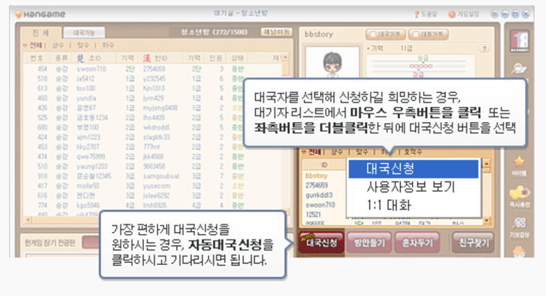 이제 같이 장기를 둘 상대를 찾아볼 시간이에요. 가장 쉬운 방법은 '자동대국신청' 을 누르는 거예요. 그러면 시스템이 알아서 저와 비슷한 실력의 상대를 찾아 바로 연결해 주거든요. 만약 특정 상대와 두고 싶다면, 오른쪽 사용자 목록에서 아이디에 마우스 오른쪽 버튼을 눌러 '대국신청'을 선택하는 방법도 있어요. 처음에는 자동으로 매칭하는 게 마음 편하더라고요.