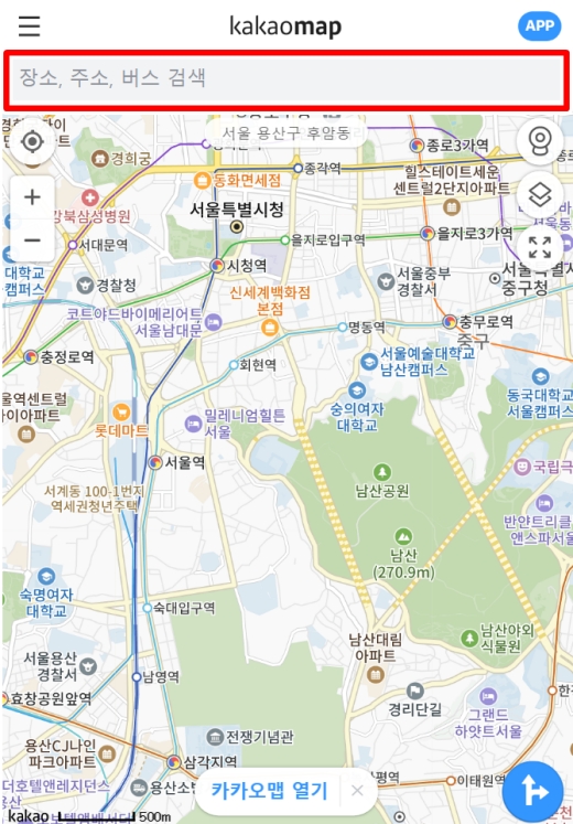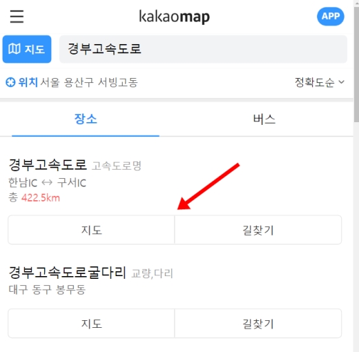 이번에는 우리가 자주 사용하는 지도 앱을 활용하는 방법이에요. 먼저 카카오맵 사이트에 접속해서 화면 상단에 있는 검색창에 내가 확인하고 싶은 고속도로 이름을 입력해 주세요. 저는 예시로 '경부고속도로'라고 검색해 봤습니다.