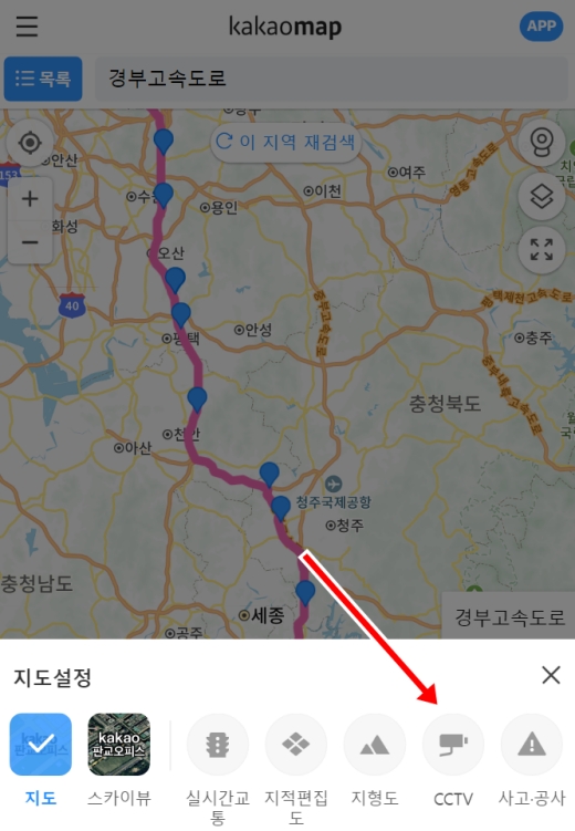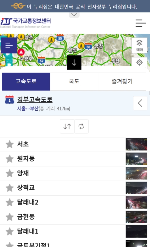 검색 결과에 '경부고속도로'가 나타나면 해당 항목을 눌러주세요. 그러면 고속도로 전체 노선이 지도 위에 표시되는데, 여기서 바로 CCTV를 볼 수 있는 건 아니에요. 숨겨진 기능을 찾아내야 한답니다.