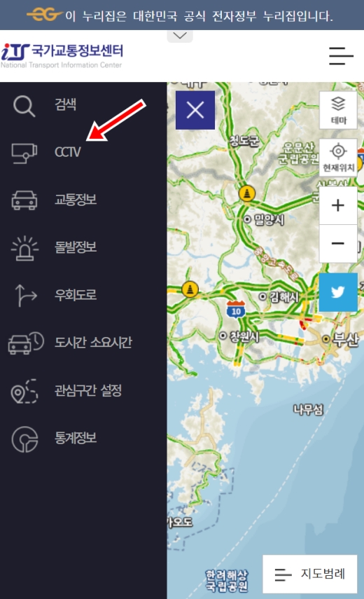 메뉴 버튼을 누르면 왼쪽에 검색, CCTV, 교통정보 등 여러 항목이 세로로 쭉 나타나요. 우리는 여기서 다른 건 볼 필요 없이, 카메라 모양 아이콘과 함께 있는 'CCTV'라는 글자를 찾아서 선택하면 된답니다. 이름 그대로 전국의 모든 고속도로 CCTV를 볼 수 있는 곳으로 바로 연결돼요.