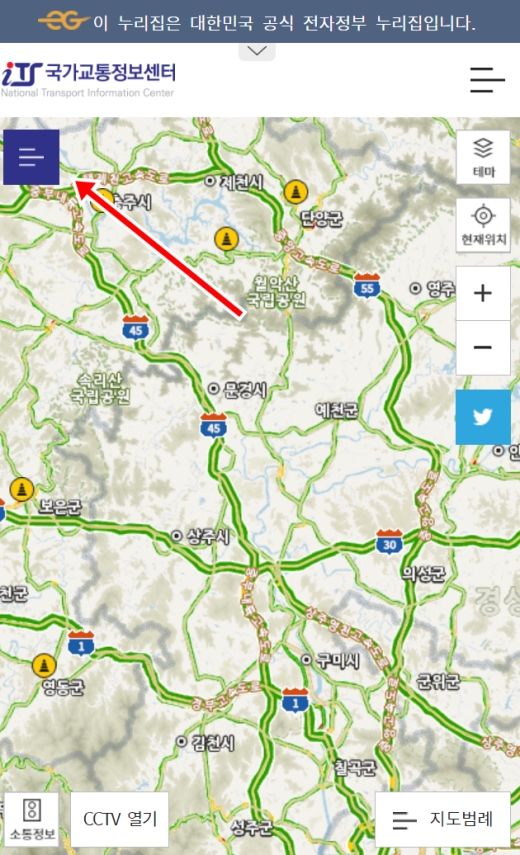 가장 먼저 국가교통정보센터를 이용하는 방법을 알려드릴게요. 인터넷 검색으로 '국가교통정보센터' 사이트에 처음 들어가면 전국 지도가 화면에 꽉 차서 어디를 봐야 할지 당황스러울 수 있어요. 이럴 땐 다른 곳에 시선 뺏기지 말고, 화면 왼쪽 맨 위에 있는 가로줄 세 개 모양의 메뉴 버튼을 찾아 눌러주세요.