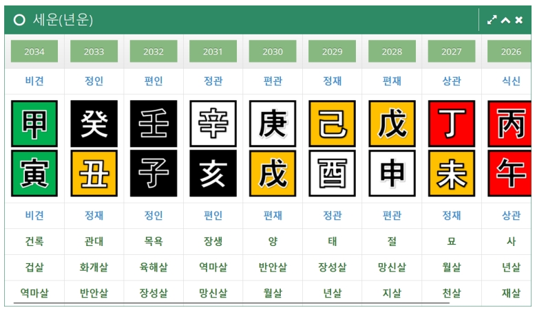 10년 단위의 큰 운을 확인했다면, 이제 매년의 운세인 '세운'을 살펴볼 차례예요. 대운 바로 아래에 위치해 있는데, 2026년부터 2034년까지 앞으로 다가올 해들의 운을 미리 살펴볼 수 있답니다. 이걸 보면서 내년에는 어떤 기운이 강할지 예측해 볼 수 있어서 흥미로웠어요.