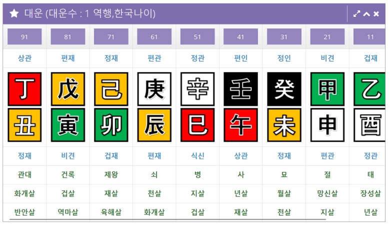 결과 화면이 나오면 한자가 많아서 조금 어렵게 느껴질 수 있지만, 가장 먼저 '대운'이라고 표시된 부분을 보세요. 이것은 10년 주기로 바뀌는 인생의 큰 운의 흐름을 보여주는 거예요. 11세, 21세, 31세 등 나이대별로 어떤 기운이 들어오는지 한눈에 볼 수 있어서 인생의 큰 그림을 그려보는 데 도움이 되었어요.