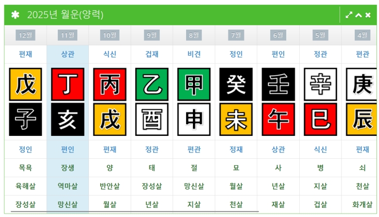 연간 운세보다 더 자세하게, 매달의 운세가 궁금하다면 '월운'을 확인하면 돼요. 특정 연도의 각 달에 어떤 기운이 들어오는지 12달 전체를 보여줘요. 이걸 참고하면 중요한 계획을 세울 때 어느 달이 나에게 더 유리할지 참고할 수 있어서 실용적이었어요.