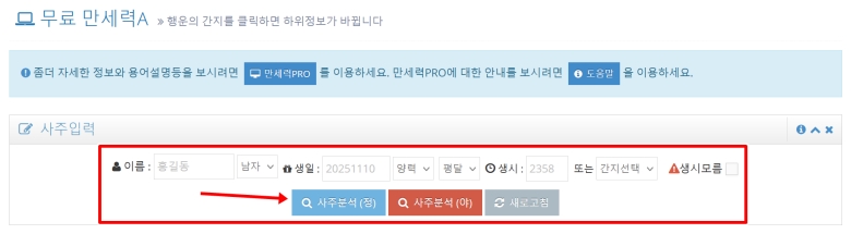 이제 자신의 정보를 입력할 차례예요. 이름과 성별, 그리고 가장 중요한 생년월일과 태어난 시간을 정확하게 입력해야 해요. 양력인지 음력인지도 잘 선택해야 결과가 달라지지 않아요. 모든 정보를 입력했다면, 아래에 있는 파란색 '사주분석 (정)' 버튼을 눌러주면 바로 결과가 나타납니다.