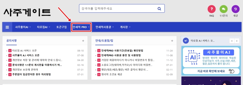 처음 보는 곳이라 메뉴가 많아 어디부터 봐야 할지 조금 헷갈릴 수 있어요. 인터넷 검색으로 만세력 사이트에 접속한 뒤, 다른 건 보지 않고 상단에 있는 메뉴들 중에서 '만세력 PRO'를 먼저 찾아 눌러주었습니다. 여기가 모든 과정의 시작점이에요.