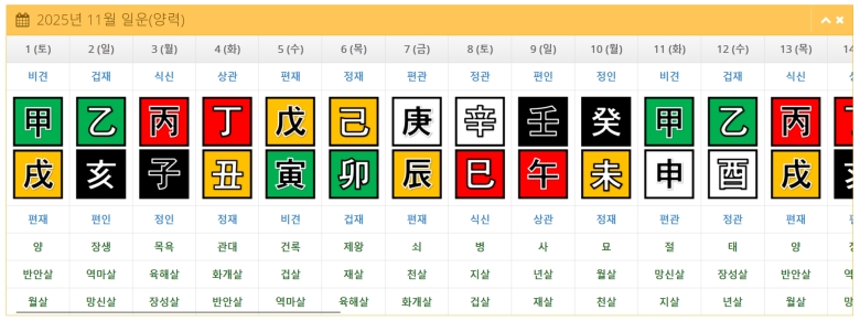 가장 세밀하게는 매일매일의 운세를 알려주는 '일운'까지 볼 수 있어요. 특정 월을 선택하면 달력처럼 1일부터 말일까지 각 날짜의 기운을 모두 보여준답니다. 이걸 보면서 오늘 나에게 어떤 기운이 작용하는지 확인하는 것도 소소한 재미가 될 것 같아요.